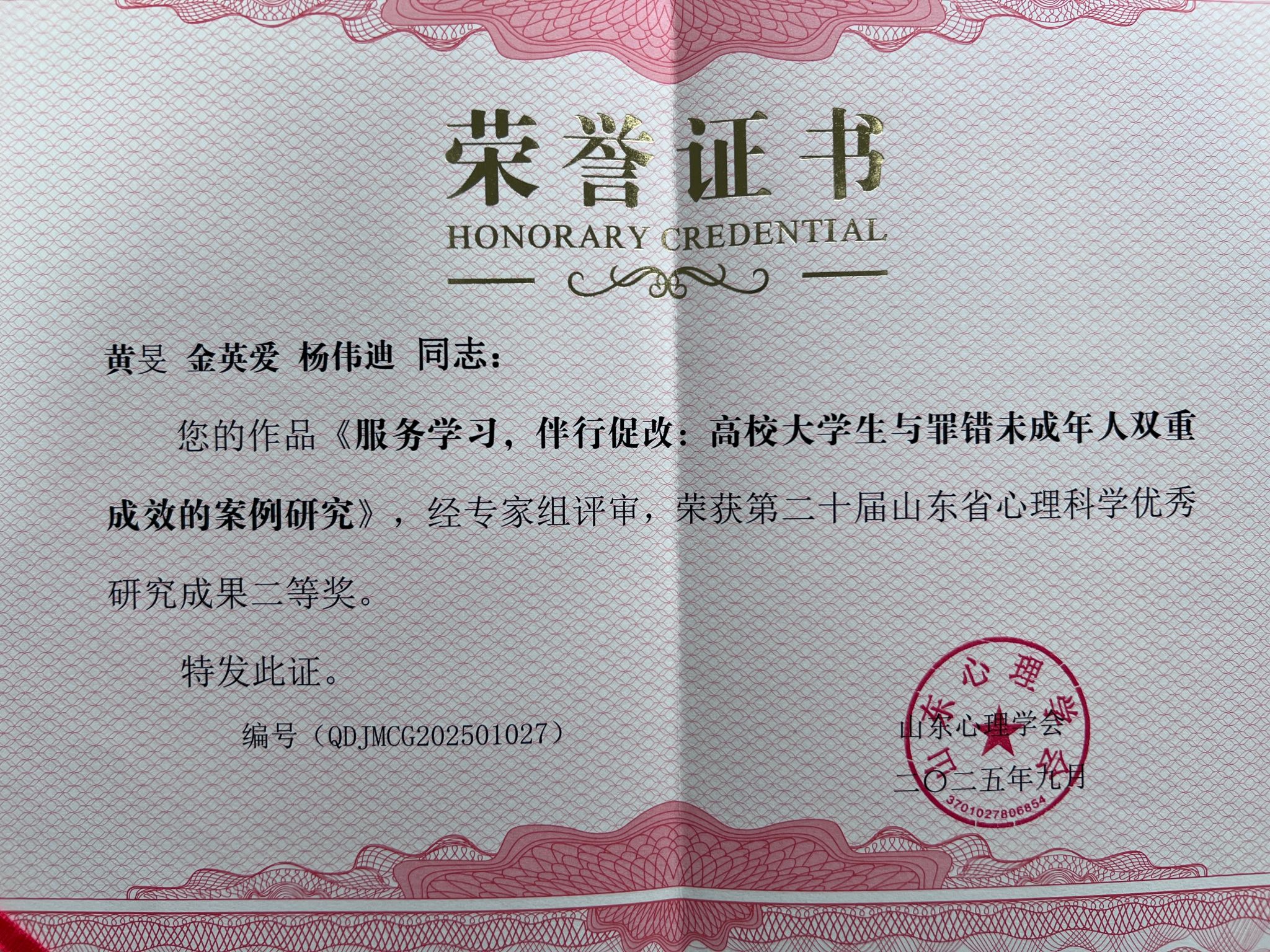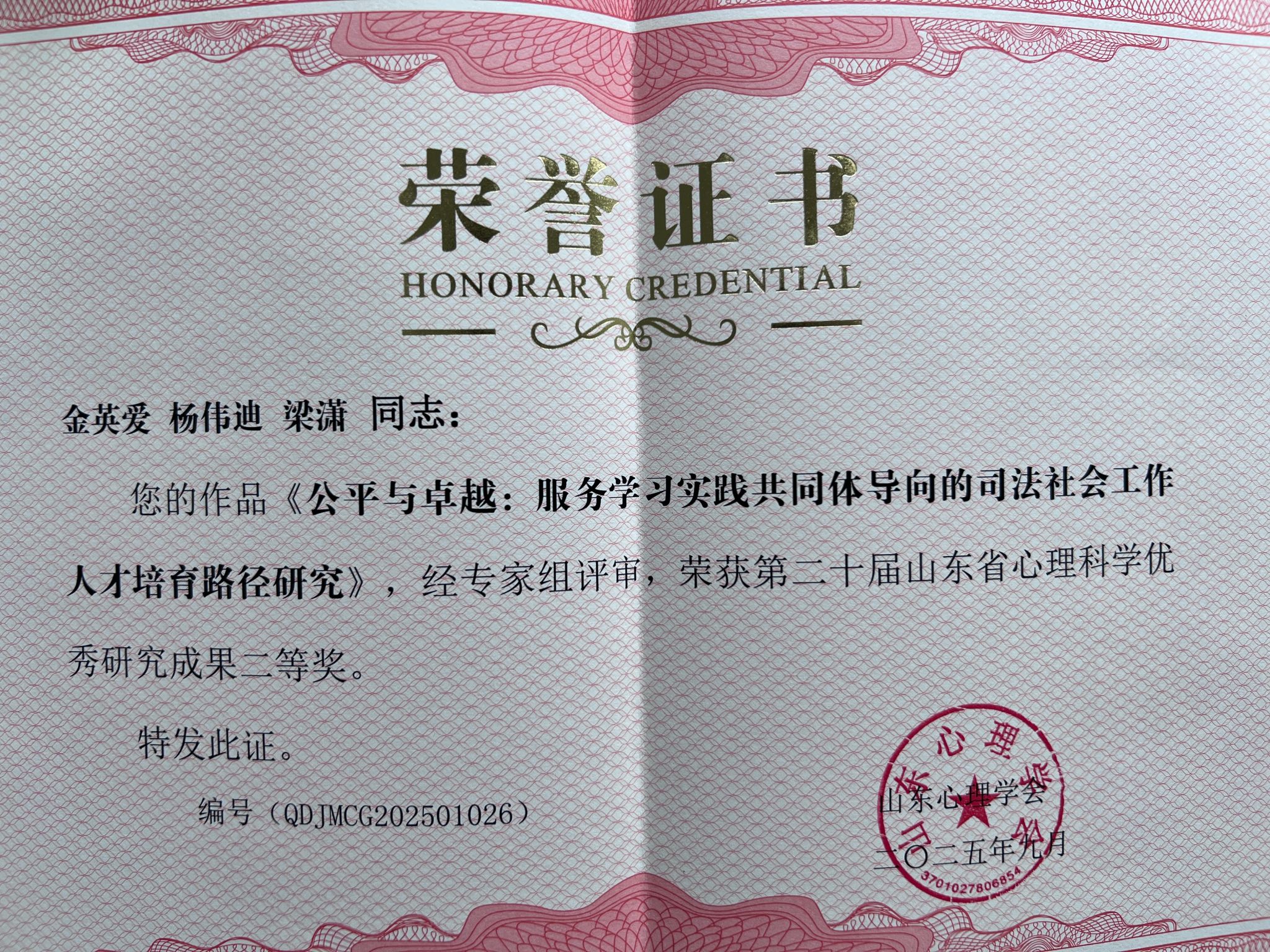 2025年9月20日—21日,山东心理学会2025年度学术会议在山东大学青岛校区召开。本次会议以“人工智能赋能心理学:理论发展与实践探索”为主题,汇聚全省心理学及相关领域专家学者,共话学科前沿与实践创新。会上传来喜讯,bw必威西汉姆联官网社会工作专业金英爱副教授负责完成的两项专题研究成果——《公平与卓越:服务学习实践共同体导向的司法社会工作人才培育路径研究》与《服务学习,伴行促改:高校大学生与罪错未成年人双重成效的案例研究》,经专家组多轮评审,双双荣获第二十届山东省心理科学优秀研究成果二等奖,彰显了bw必威西汉姆联官网在司法社会工作领域的专业研究实力与实践创新水平。