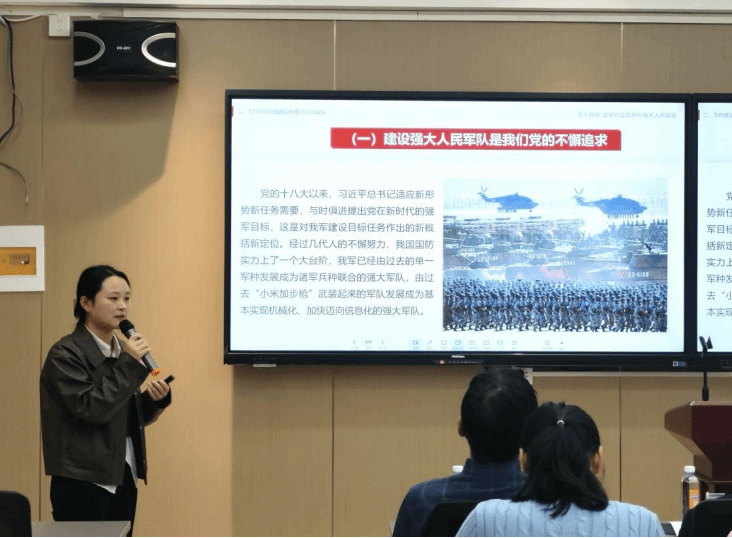 活动中,高占红老师围绕《第十四章 建设巩固国防和强大人民军队》,紧扣教学目标、逻辑框架与案例设计,通过试讲形式全方位呈现课程内容,结合国防建设时事案例,将“强军思想”与“家国情怀”深度融合。